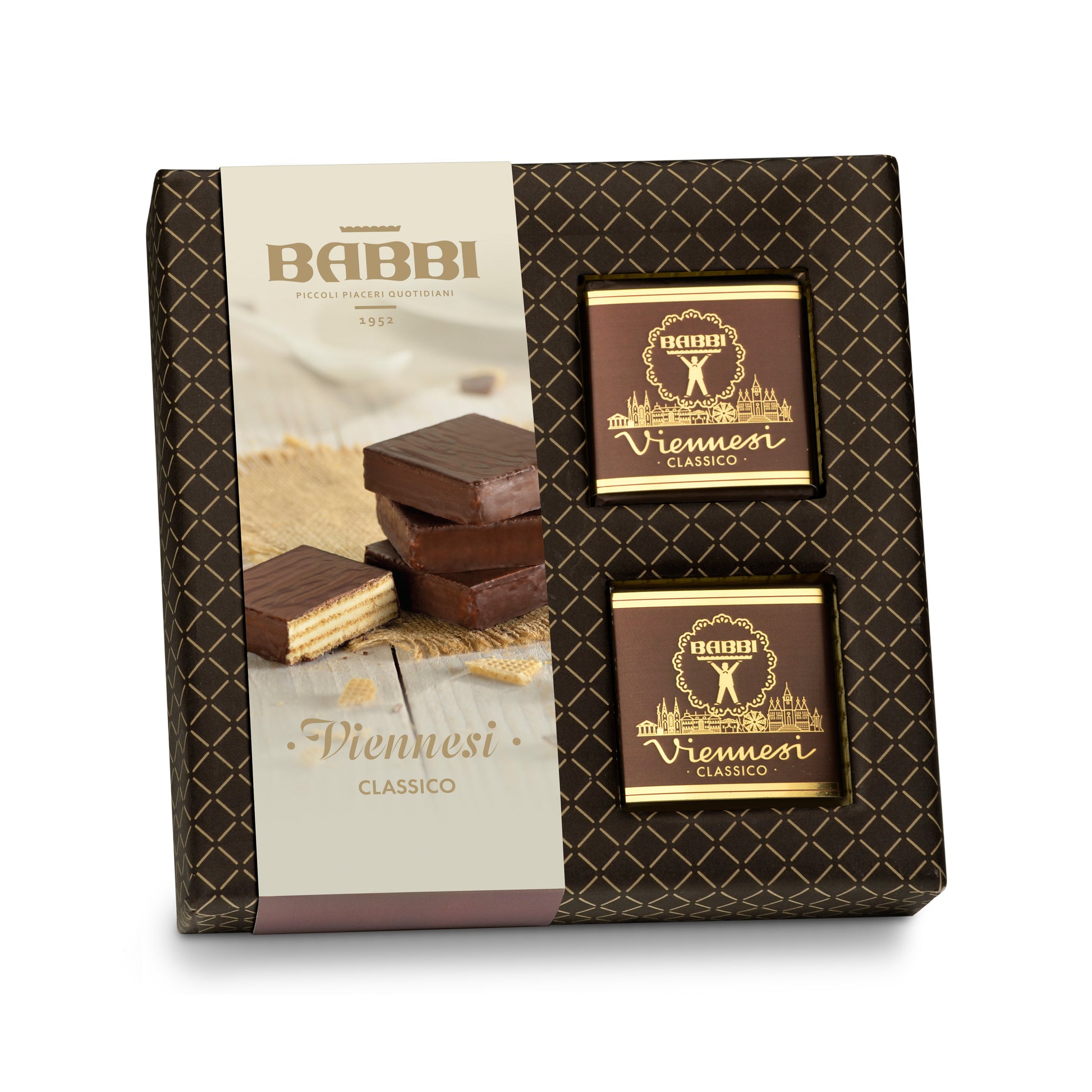 A beautiful hard cover box is a luxurious gift item. Inside find four large, stacked squares of Viennesi dark milk chocolate wafer cookies inside.