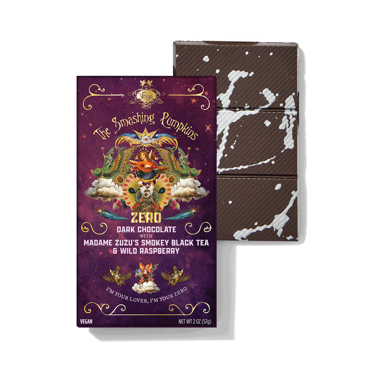 Bold, mysterious, and beautifully defiant, ZERO is a dark and complex expression of contrast. 62% dark chocolate meets Madame ZuZu’s Forbidden Forest Lapsang Souchong, black raspberries, and wild raspberries, creating a smokey, tart masterpiece that mirrors the song’s raw emotional power. Deep and dramatic, this vegan dark chocolate bar captures the tension between light and shadow with a flavour of symphony.
